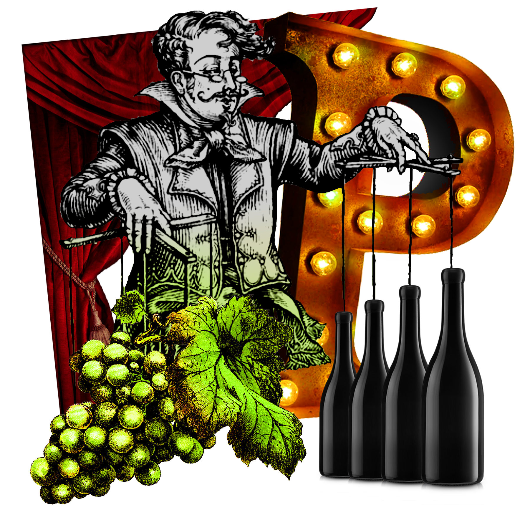 Theatrical collage with vintage winemaker illustration, grape clusters, red curtain, and wine bottles representing The Producers wine subscription