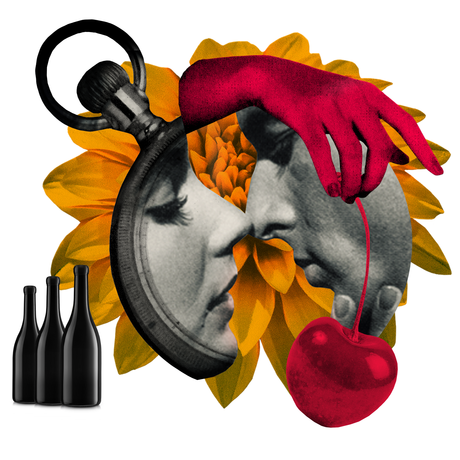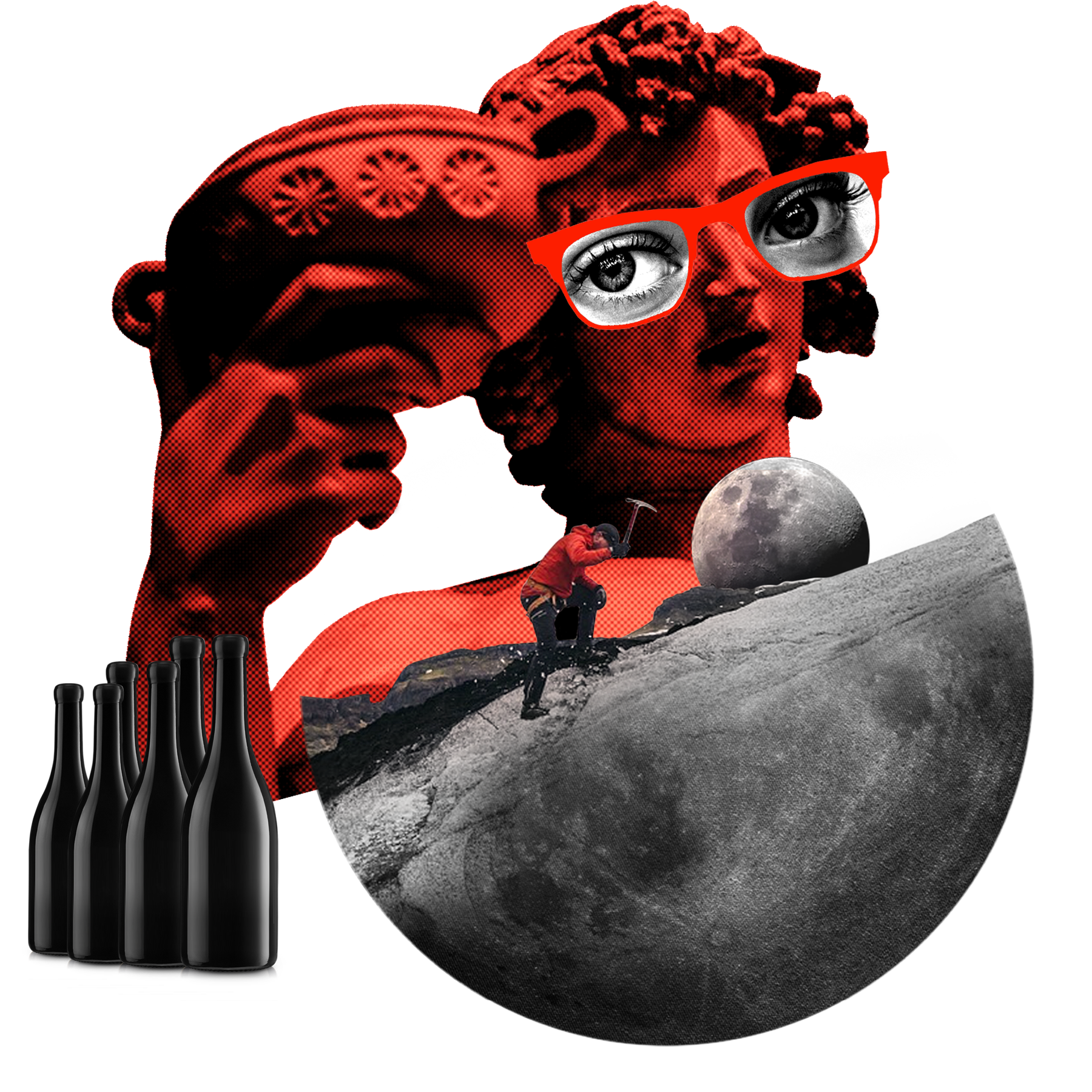Surreal wanderlust collage with vintage portrait wearing sunglasses, lunar landscape, and wine bottles representing The Traveller wine subscription
