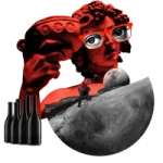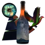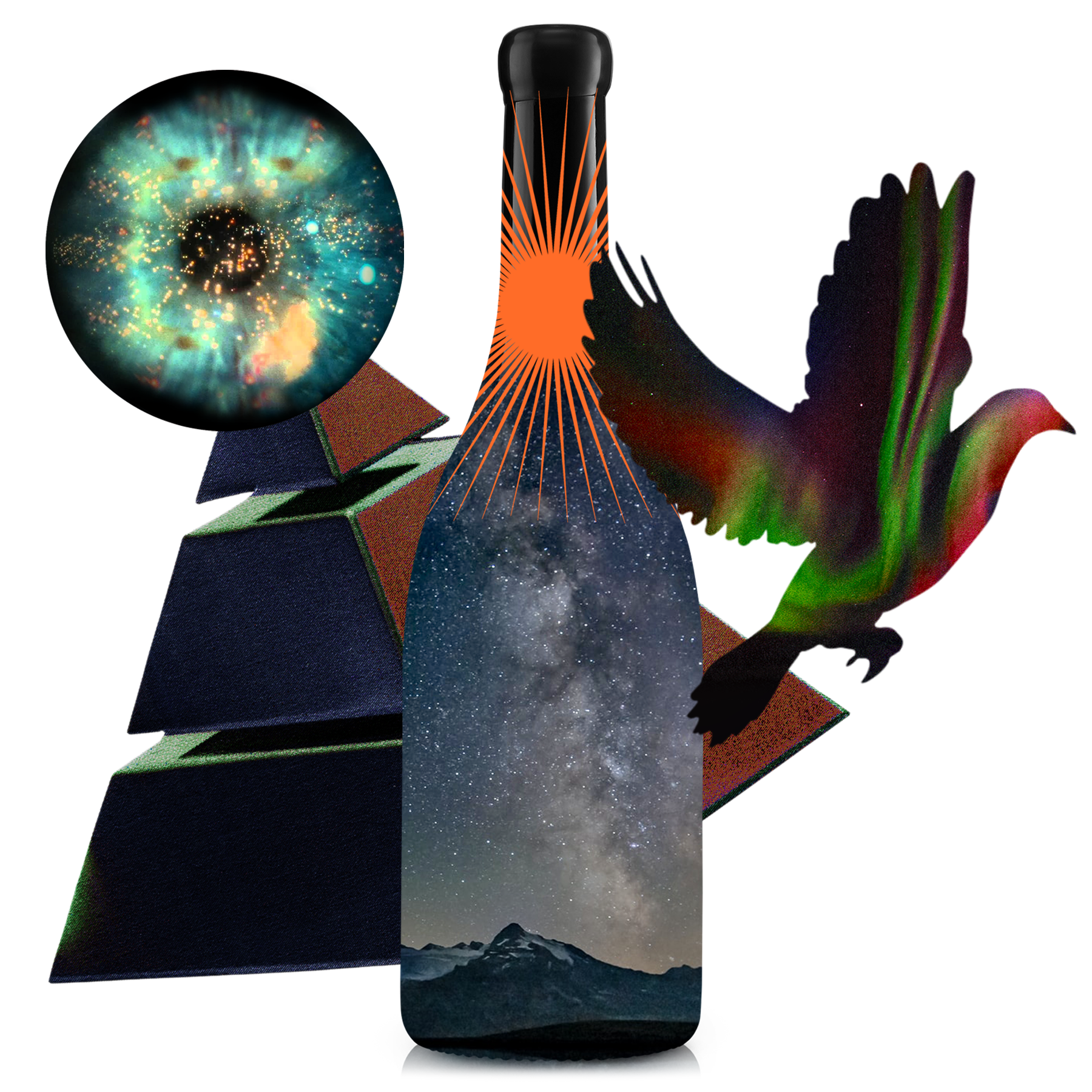 Cosmic collage from another galaxy with wine bottle, Tyrell Corporation celestial orb, flying bird, and starry night sky representing The Northern Star wine subscription