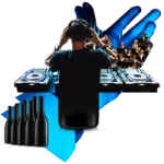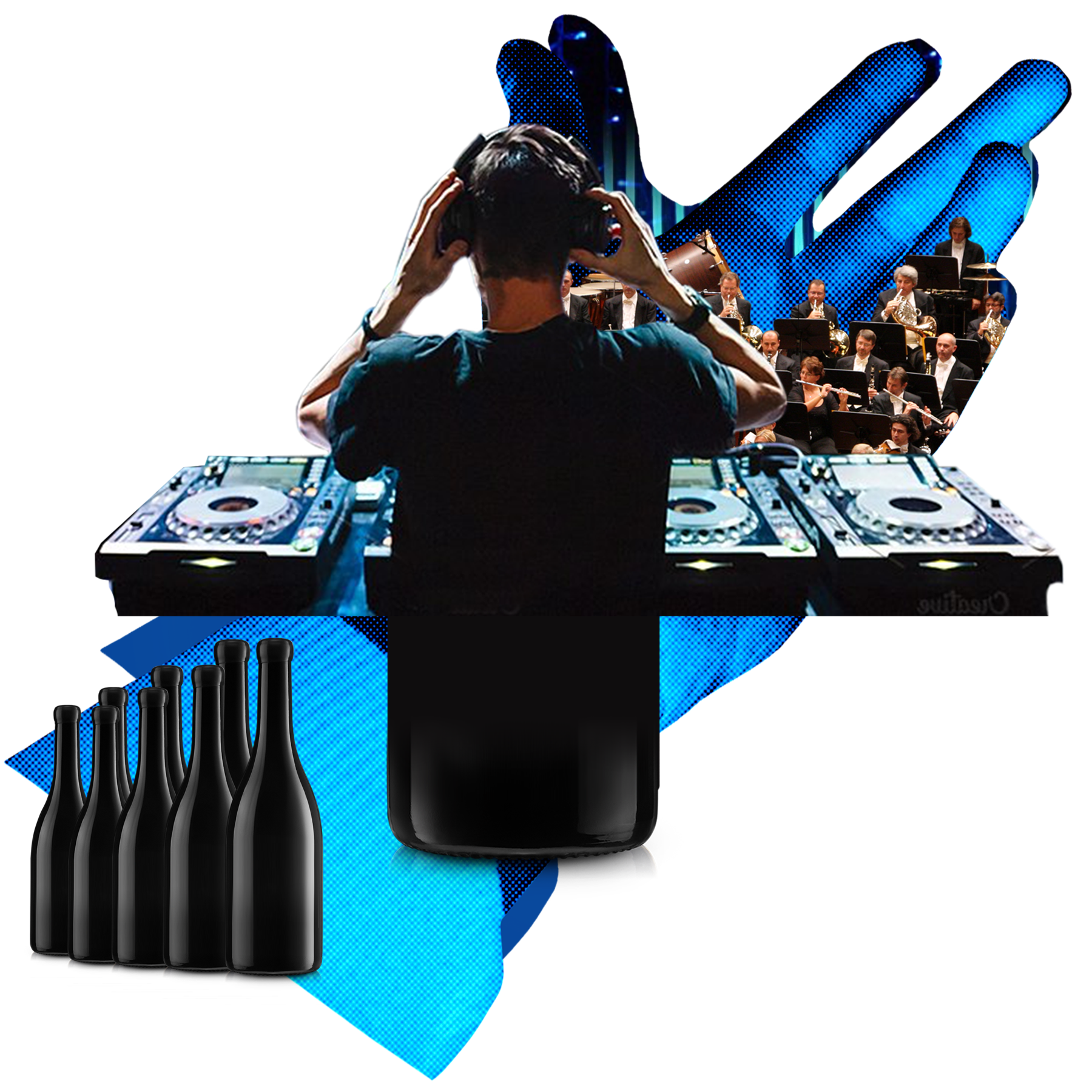 Dynamic collage with DJ at turntables, crowd of people, and wine bottles representing The Master wine subscription