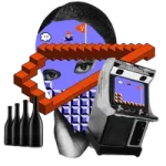 Digital art collage with wine bottles, retro gaming elements, and pixelated graphics representing The Next Level wine subscription